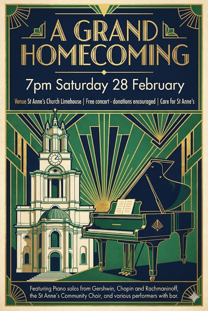 Featuring piano solos from Gershwin, Chopin and Rachmaninoff, the St Anne’s Community Choir and various performers. There will be a bar and any additional donations to Care for St Anne’s will add to our building fund.
